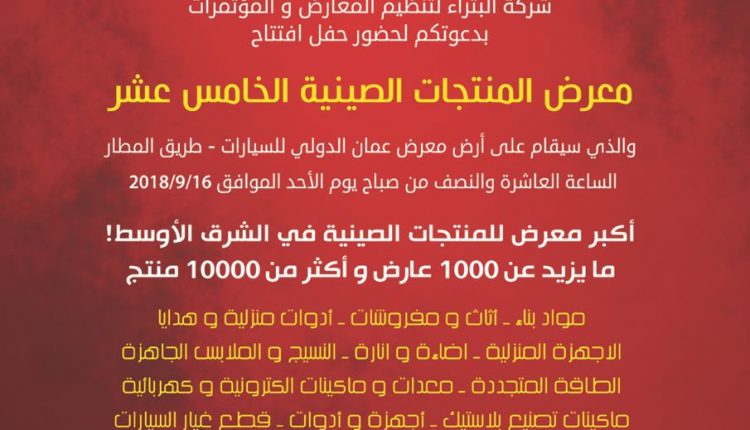 عالم السياحة- برعاية دولة رئيس الوزراء سيقام معرض المنتجات الصينية في عمان خلال الفترة من 16-18 ايلول/2018 في عمان-على ارض معرض عمان الدولي- السيارات-طريق المطار ، ويعد المعرض السنوي اكبر معرض للمنتجات الصينية في الشرق الاوسط وبمشاركة اكثر من الف شركة ومؤسسة صينية ستعرض اكثر من 10000 سلعة ومنتج، ويجدر بالذكر ان المعرض من تنظيم شركة البتراء لتنظيم المؤتمرات والمعارض وشركة مشرق الصين للاستثمارات التسويقية وتنظيم المعارض
