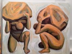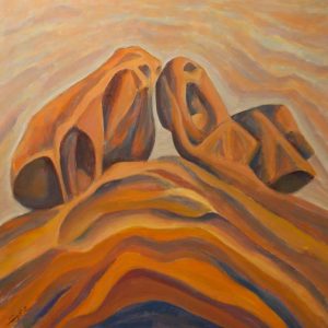 عز الدين نجيب ، يرسم الصخر ، يتلاعب في الوانه ، يداعب حس الحياة فيه … يجبر الصخر على الكلام …! يرسم وجع الانسان المخلوق من تراب ، على شكل صخور تكلست وتصلّبت ،تئن ساعة ، وتطيح بنفسها باتجاه كتف صخرة أخرى … تُرى هل يقصد نجيب أن الصخر له مشاعر .. ام أننا نحن الذين بتنا نعاني من تحجر البشر …!