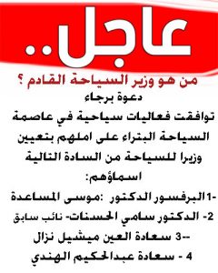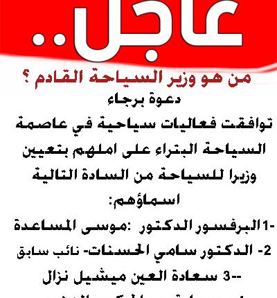 وحسب المصدر الذي طلب عدم نشر اسمه قال” من مبدأ غيرتنا على صناعة السياحة والوطن فقد توافق الكثيرين من اصحاب المنشئات السياحية والقطاع السياحي في مدينة البتراء (عاصمة السياحة في الوطن الحبيب) على تقديم النصح لاختياراسماء وطنية شابة قادرة لخدمة صناعة السياحة وتنميتها وازالة المعيقات من امامها، لتحقيق نمو يتلائم مع نمو صناعة الساحة في بلد التاريخ والحضارات الفريد من نوعه ، وتوافقت الاراء بمختلف الوسائل ، ولتدعو دولة الرئيس على استثمار الطاقات الشابة المؤهلةوالمسلحة بالخبرات العالمية والمحلية ، و اجتمعت الاراء الناصحة وقع اختيارنا بعد استعراض لكل القامات المؤهلة والموجودة على كل من السادة:
