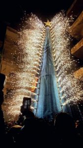 الألعاب النارية أضاءت سماء حلب عند الساعة السابعة لتضيء بعد ذلك شجرة الميلاد التي اكتست باللون الأزرق لتعلوا صيحات الحاضرين والتهليل والصفير والتصفيق معبرين عن فرحتهم بعيد الميلاد ،وتاتي احتفالات هذا العام استمرارا لاحتفالات مدينة حلب بنصرها على الإرهاب وعودة الحياة إليها بحضور محافظ حلب احيث قيم احتفال جماهيري ضمن فعالية نصر حلب في ساحة العزيزية بحلب بإضاءة أكبر شجرة عيد الميلاد. حيث قامت جمعية الجيل الجديد بنصب شجرة الميلاد وتزيين الحي وبدأ الحفل بالنشيد العربي السوري. وبين محافظ حلب ان اضاءة شجرة عيد الميلاد في حلب اليوم هي رسالة محبة وسلام من أهالي حلب للعالم أجمع وهي رسالة تحمل في مضمونها معاني الفرح والاخوة. وجاء الاحتفال بمشاركة رسمية وشعبية واسعة لاضاءة شجرة الميلاد في ساحة العزيزية وبحضور رجال الدين المسيحي والاسلامي