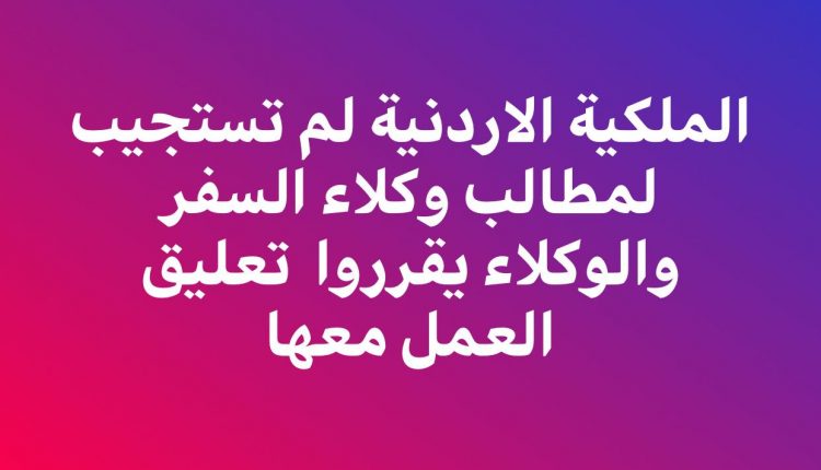 طلبت جمعية وكلاء السياحة والسفر في تعميمها رقم 255/2018 تاريخ29/12/2018 تعليق التعامل مع شركة الملكية الاردنية اعتبارا من2/1/2019 ولمدة ثلاثة ايام وذلك نتيجة عدم التوصل لاتفاق مع الملكية تنصف فيه شركات ومكاتب السياحة والسفر وكانت قد تم الاتفاق على عقد اجتماعات تناولت صيغ التعامل المنصفة للطرفين تمهيدا لتعميمها على كافة الشركات ومنها عمولة بيع التذاكر والعدالة في التنافس