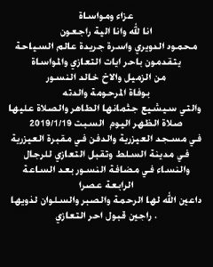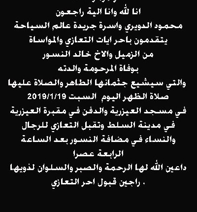 محليات اردنية عزاء ومواساة بوفاة والدة الاخ والزميل خالد النسور، رحمها الله واسكنها جناته في يناير 19, 2019 25٬902 مشاركة عزاء ومواساة انا لله وانا الية راجعون محمود الدويري واسرة جريدة عالم السياحة يتقدمون باحر ايات التعازي والمواساة من الزميل والاخ خالد النسور بوفاة المرحومة والدته والتي سيشيع جثمانها الطاهر والصلاة عليها صلاة الظهر اليوم السبت 19/1/2019 في مسجد العيزرية والدفن في مقبرة العيزرية في مدينة السلط وتقبل التعازي للرجال والنساء في مضافة النسور بعد الساعة الرابعة عصرا داعين الله لها الرحمة والصبر والسلوان لذويها ، راجين قبول احر التعازي 25٬902 مشاركة