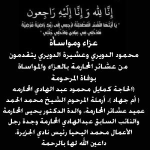 محمود الدويري وعشيرة الدويري يتقدمون من عشائر المحارمة بالعزاء والمواساة بوفاة المرحومة (الحاجة كمايل محمود عبد الهادي المحارمه اعلانات-واخبار-قصيرة-Ads-and-short newsتعازي اخر تحديث فبراير 16, 2019 11٬892 مشاركة عزاء ومواساة محمود الدويري وعشيرة الدويري يتقدمون من عشائر المحارمة بالعزاء والمواساة بوفاة المرحومة (الحاجة كمايل محمود عبد الهادي المحارمه ( أم جهاد )، أرملة المرحوم الشيخ محمد الحمد عميد عشائر المحارمة، والدة الدكتور يحيى المحارمة والنائب السابق عبدالهادي المحارمة وجدة رجل الأعمال محمد اليحيا رئيس نادي الجزيرة، داعين الله لها بالرحمة 11٬892 مشاركة